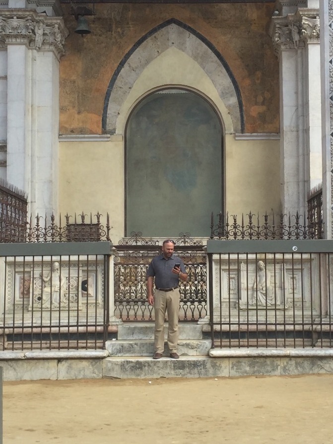 brent1Member Brent Mayr reading on the steps of  the Palazzo Publico taken from the Piazza del Campo in Siena, Tuscany, Italy. The relative significance of this location to the Declaration is two-fold. First, the Palazzo was home to one of the first forms of republican government outside of Rome. Second, and more importantly, painted on the walls inside are two famous frescos, The Allegory of Good Government and The Allegory of Bad Government. In The Allegory of Good Government, the central character is guided by Faith, Hope, and Charity, while conferring with the proper virtues necessary for a proper and just ruler: Peace, Fortitude, Prudence, Magnanimity, Temperance and Justice. Appropriately, Justice is depicted balancing the scales held by Wisdom.  On the other hand, in The Allegory of Bad Government, the central figure is a demonish looking character with horns and fangs depicting Tyranny.  Surrounding him are characters representing Cruelty, Deceit, Fraud, Fury, Division, and War.